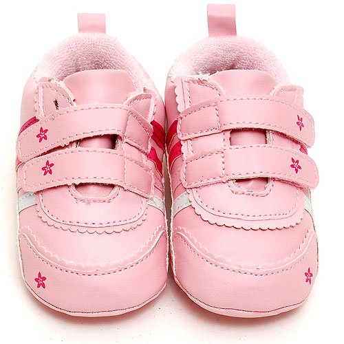These adorable pink sneakers by Luna International are perfect for you baby girl.  The baby shoes feature stripes on the side, printed flowers, and scalloped edging.  Easy to put on with a tongue and a strap in the back and they fasten with Velcro.  The shoes have easy-grip rubber soles shaped as a baby's foot.
